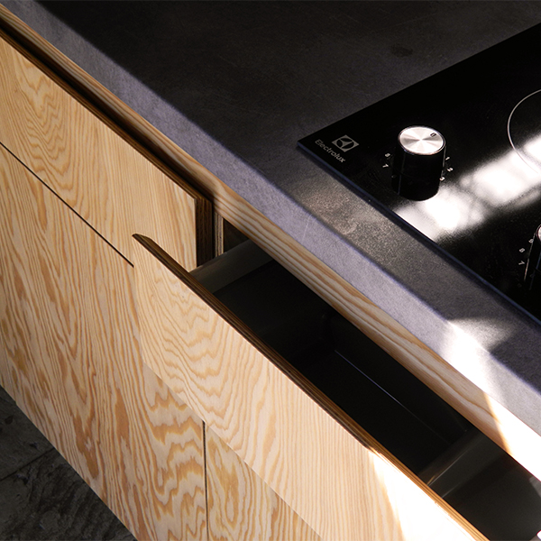 Pentru că atelierul nostru este specializat în lucrul cu lemn masiv, evităm comenzile cu fronturi de uși și sertare din PAL melaminat sau MDF vopsit, însă putem combina soluții în care carcasele corpurilor de mobilier sunt din placaj de mesteacăn, molid triplustrat sau PAL melaminat.